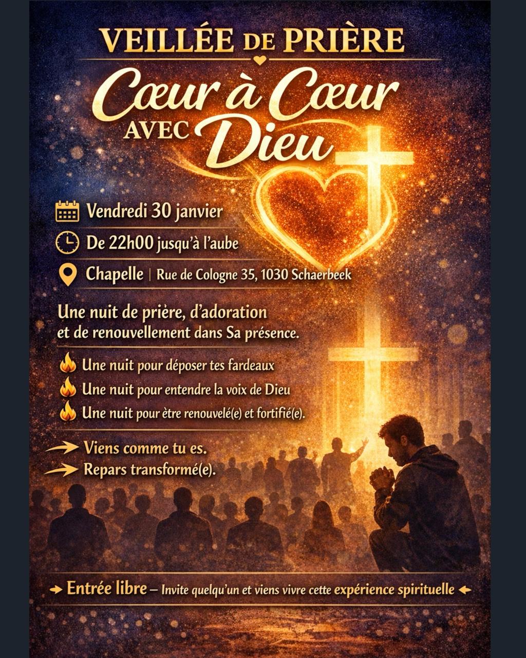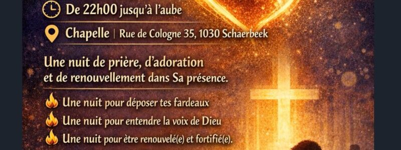 A partir de ce soir il y aura des veillées de prière, chaque vendredi de 22h à 5h: dans la ‘Chapelle 1030’ (Rue de Cologne 35, Schaerbeek): en français et anglais. Initié par les ‘Ambassadeurs du Royaume de Dieu’. Tout le monde bien venu!