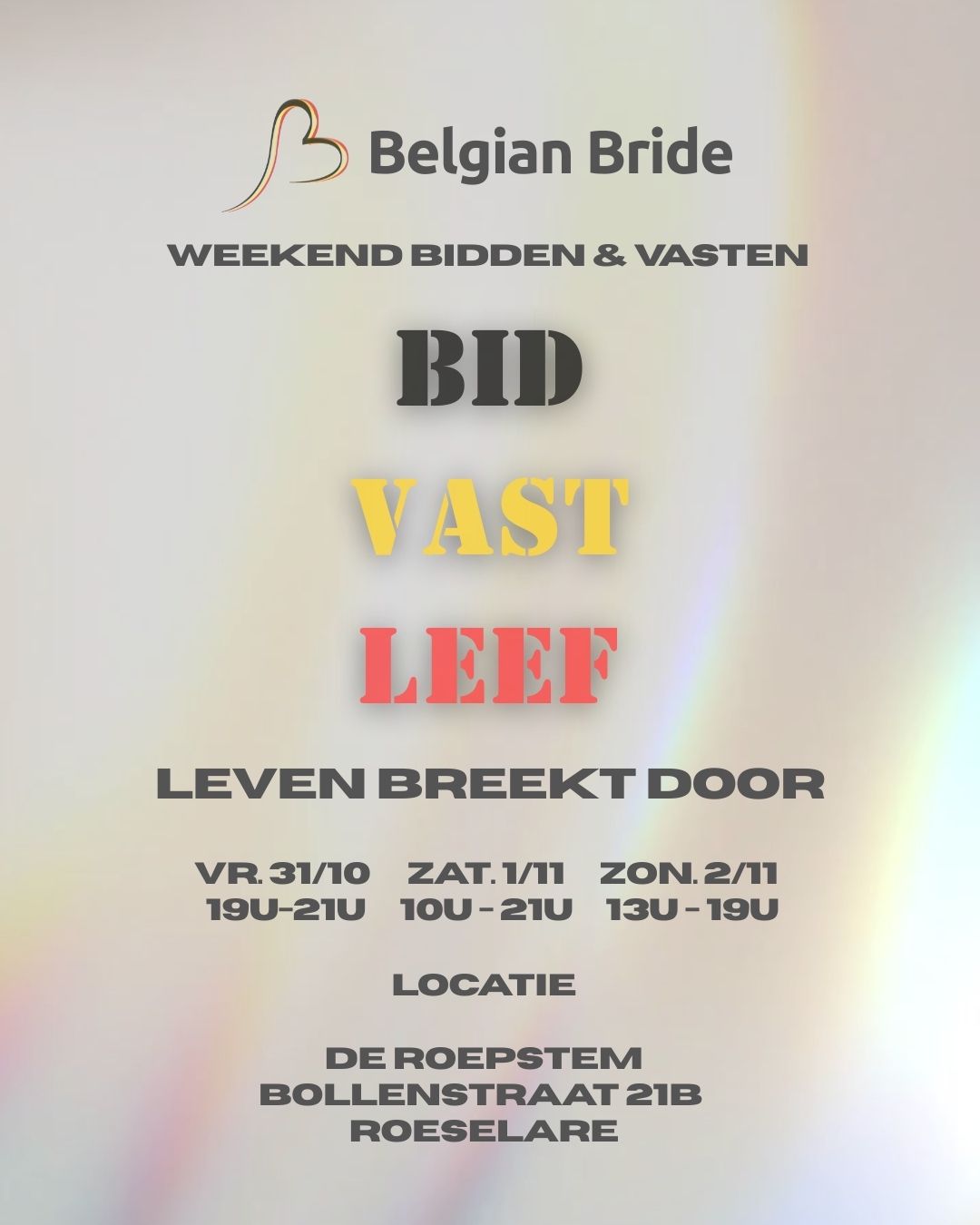 BID VAST LEEF: Een feest van Leven: een weekend bidden & vasten in Roeselare Doelstelling is een doorbraak van Gods leven in ons eigen leven & geliefde land België. PROGRAMMA: Vrijdag 31 Oktober: 18u-21u Zaterdag 1 November: 10u- 21u Zondag 2 November: 14u-19u Meer info volgt nog, maar je kunt alvast verwachten: – Aanbidding – Onderwijs (focus is “Leven”) – Bekering – Gezamenlijke proclamaties (focus is “Leven”) – Doorbraken in ons leven en het land LOCATIE: De Roepstem, Bollenstraat 21b, 8800 Roeselare Voor alle vragen: BelgianBride@gmail.com (vzw Belgian Bride is de bediening van Brecht & Iara Van Neste) In samenwerking met Ignace Demaerel van Pray4Belgium Tickets bestellen: https://www.tickettailor.com/events/belgianbride/1844806